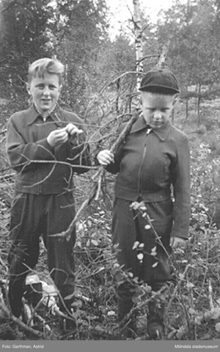 Bröderna Leif och Alf Garthman står i ett skogsområde i Mölndal, 1950-tal.