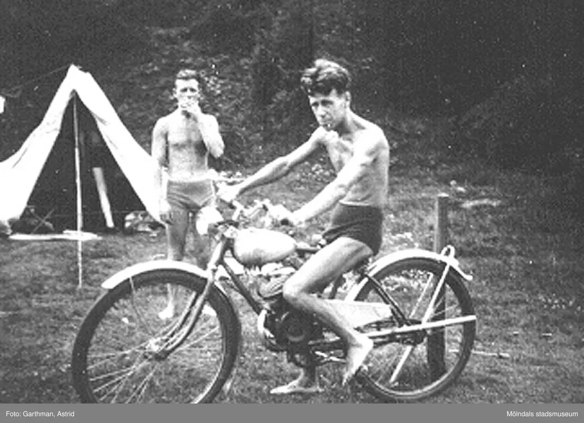 Bror Eriksson sitter på sin lättviktare 98cc Husqvarna. I bakgrunden står Helmer Garthman. Fjärås Bräcka, 1935.