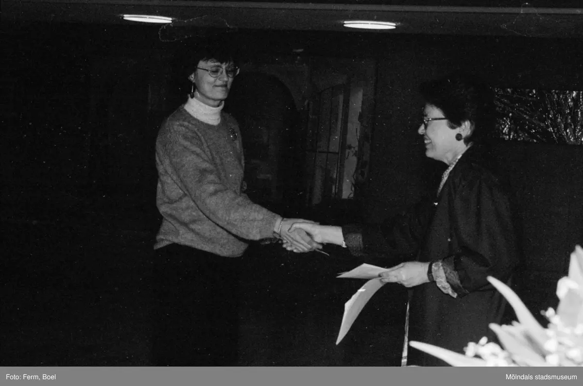 Prisutdelning i Mölndals stadshus vid tävling om Mölndals souvenirer i februari 1992. Konstintendent Bodil Magnusson, till vänster, vann andrapris. Den som delar ut blommorna är Kultur- och fritidsnämndens ordförande, Sonja Knutsson.