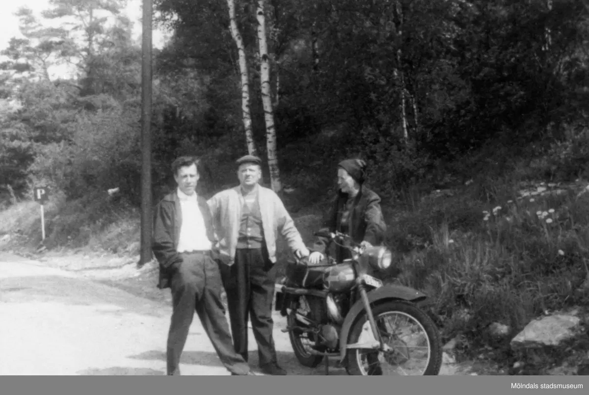 Bror Eriksson samt Helmer och Astrid Garthman som står på en landsväg brevid sin motorcykel Husqvarna 175cc (kallades Drömbåge). Mölndal, 1960-tal.