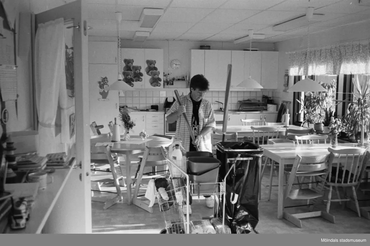 En kvinnlig personal, iklädd städrock, svabbar köksgolvet vid Katrinebergs daghem. Framför henne står en tidstypisk städvagn. I köket står flera bord med trip trap stolar och vanliga stolar.