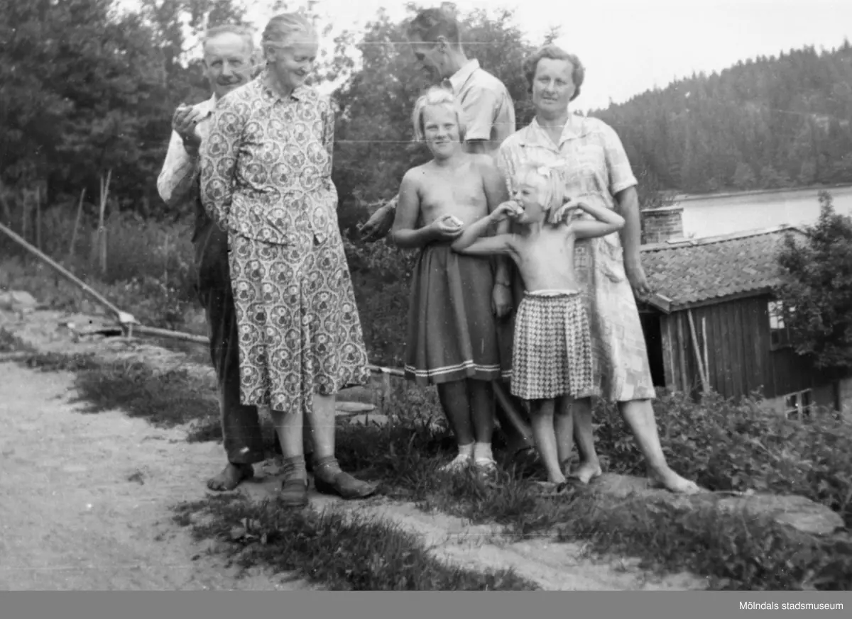 Solveig Garthman, Sonja Svensson, Marianne Svenssson, Augusta Persson och Albert Persson som poserar utanför huset på Långön, 1950.