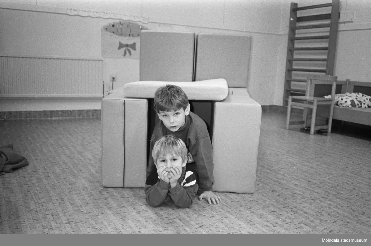 Två pojkar tittar fram från en egenbyggd koja. Den består av småkuddar som omringar dem på sidorna och ovanpå. I rummet kan man se en vägghängd ribbstol, en liten säng och en barnstol. På golvet ligger en kork-liknande linoleum-matta.