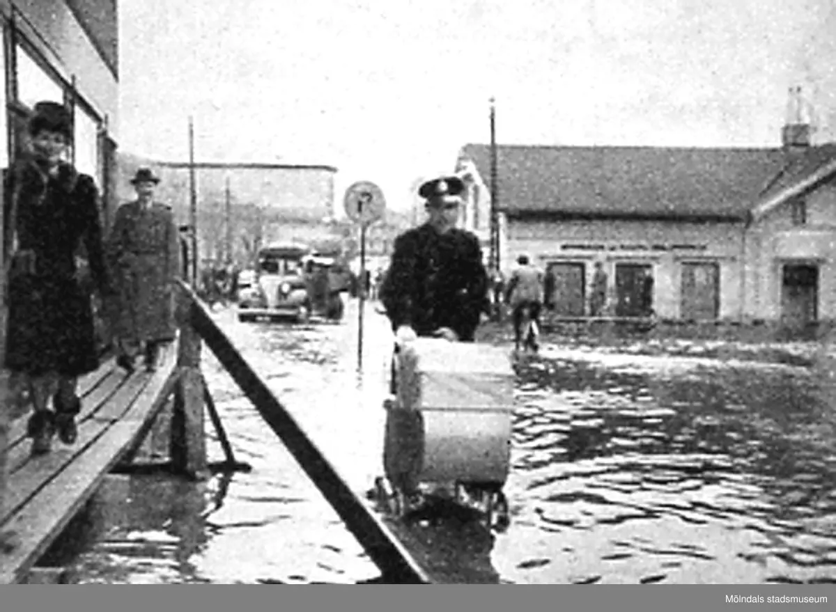 Översvämning vid Mölndalsbro, okänt årtal. Avfotograferad ur "Mölndal 1922 - 1947".