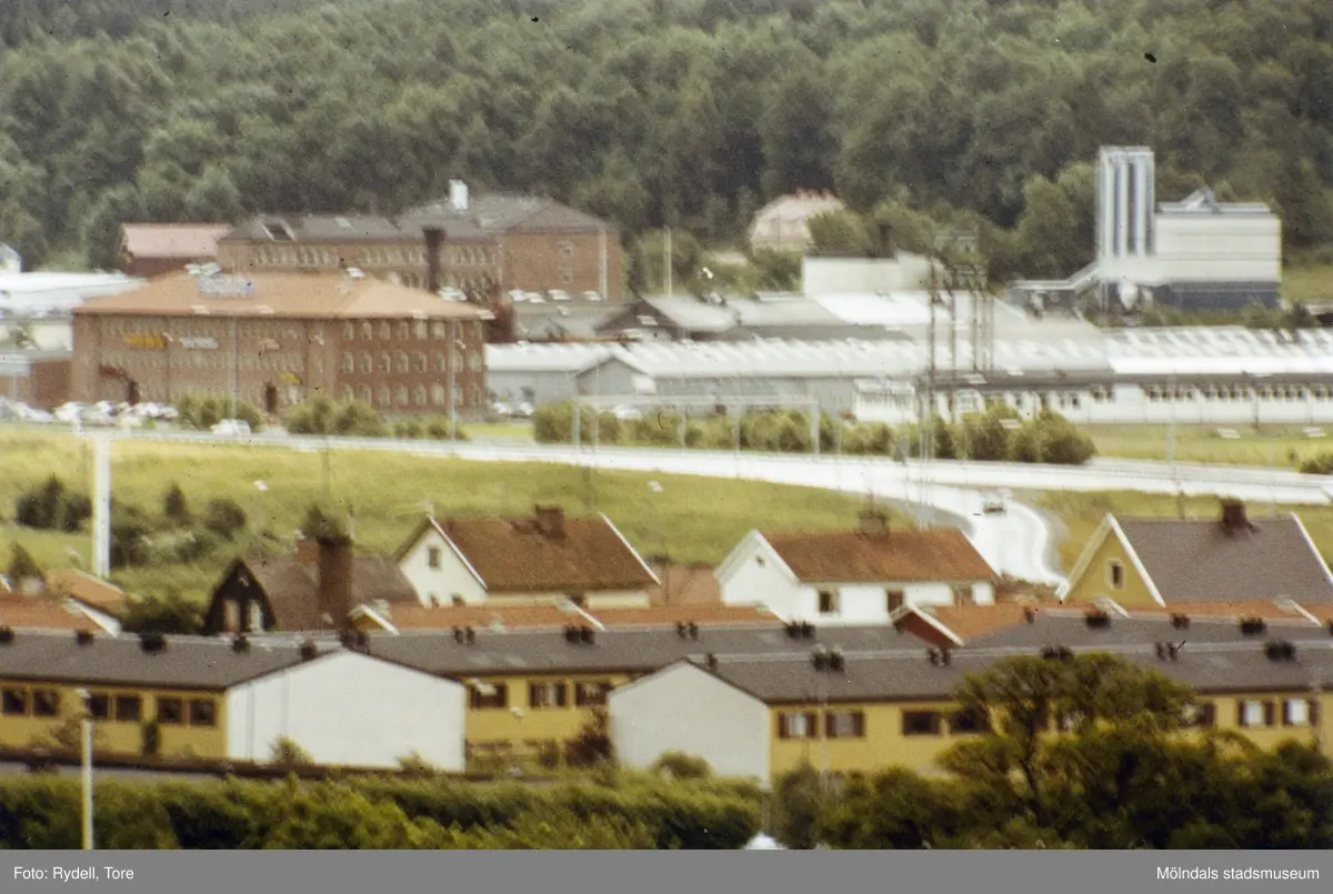 Vy över bostadsbebyggelse i Brännås mot byggnader i Åbro industriområde. Mölndal på 1970-talet.