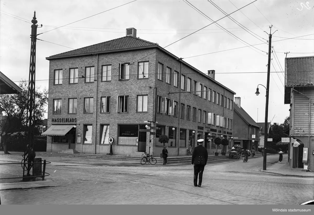 Hantverkshuset i Mölndalsbro, Mölndal, 1930-1950-tal. Fasader mot Kungsbackavägen och Frölundagatan. Vy från gamla Mölndals Bro.