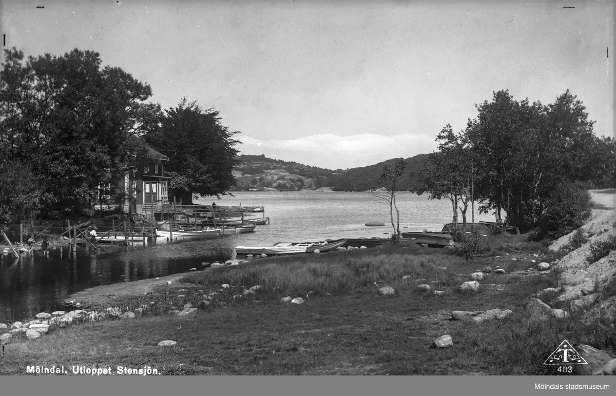 Stensjöns utlopp i Mölndalsån. Till vänster ses Sjövillan. Notera stenen en bit ut i sjön. Den kallas "Röa mössa" och användes till att mäta vattennivån i sjön.