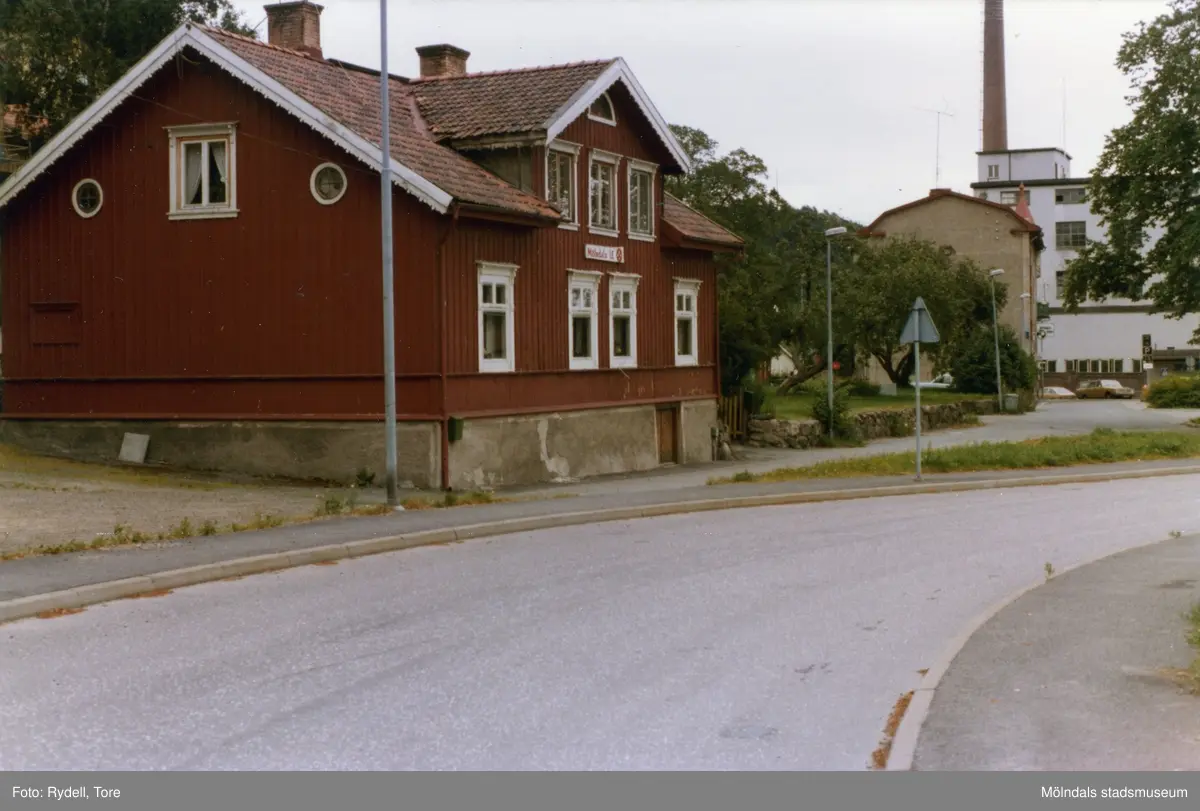 Trädgården i Mölndal på 1970-talet. Trädgårdsgatan 10, även kallat "Klubben". Huset har varit föreningslokal för Kvarnby basket och Länkens kamratförbund. I bakgrunden till höger ses gaveln till huset Trädgårdsgatan 4 samt byggnad tillhörande pappersbruket Papyrus.