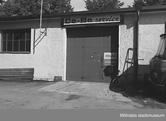 Garageinfart med skylten "Ce-Be service" över, hösten 1994. Före detta spinneriet Bettyholm/Carlsfors/Forsåkers fabriker "övre".
