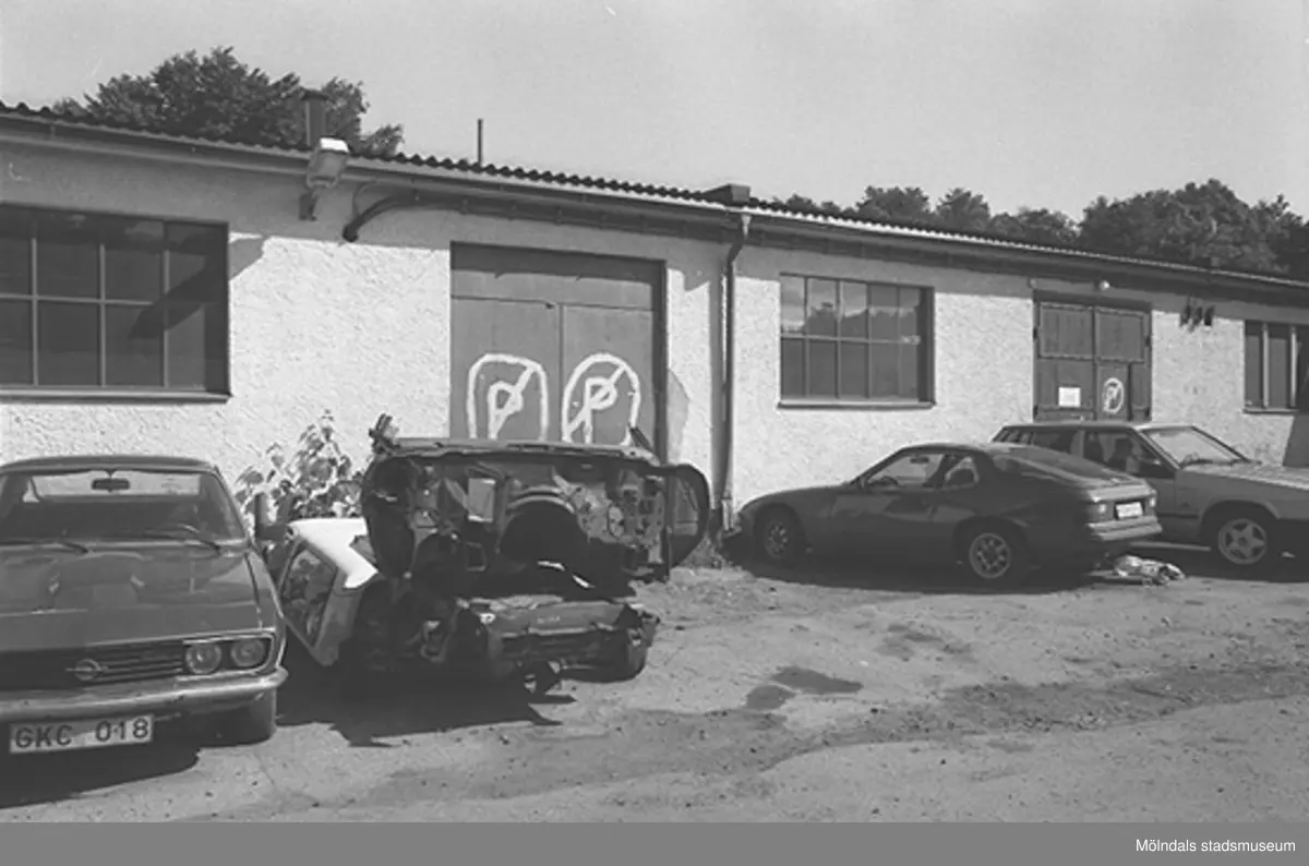 Garageinfart med bilar utanför, hösten 1994. Före detta spinneriet Bettyholm/Carlsfors/Forsåkers fabriker "övre".