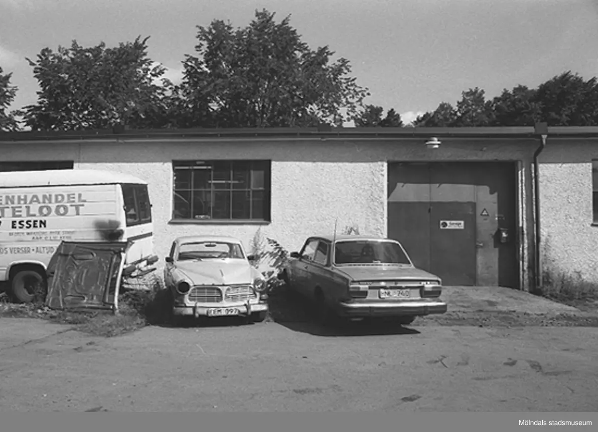 Garageinfart med bilar utanför, hösten 1994. Före detta spinneriet Bettyholm/Carlsfors/Forsåkers fabriker "övre".