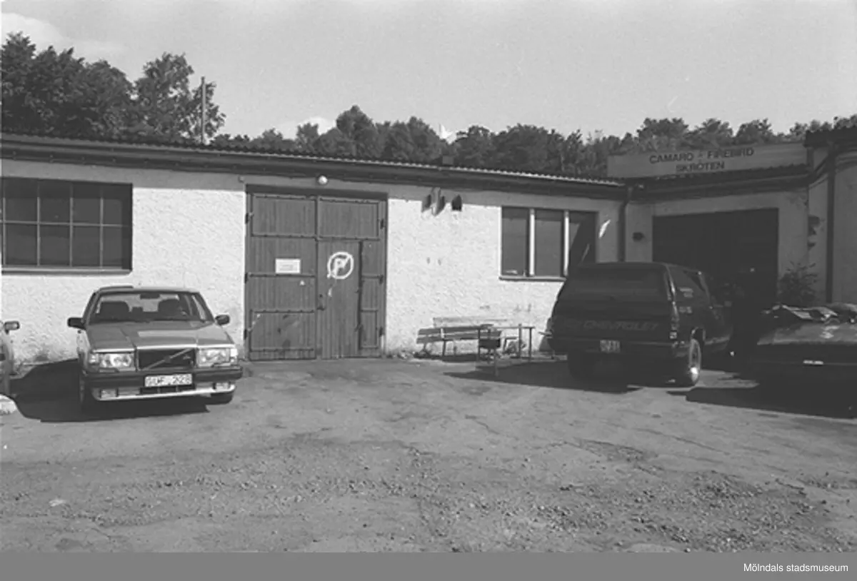 Garageinfart med bilar utanför, hösten 1994. Före detta spinneriet Bettyholm/Carlsfors/Forsåkers fabriker "övre".