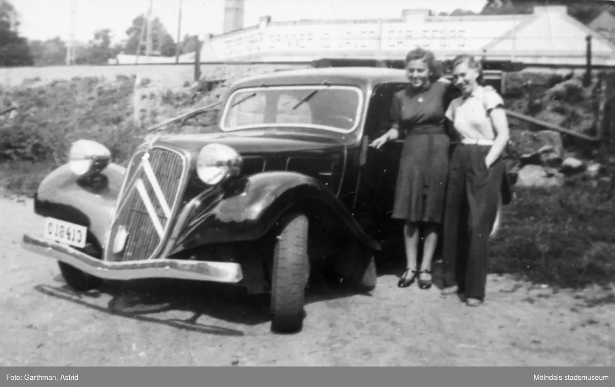 Två kvinnor står vid en Citroén B-11 med reg.nr: 018413, Kvarnfallet 31, 1940-tal. Kvinnan till höger är Margit (fotografens syster).