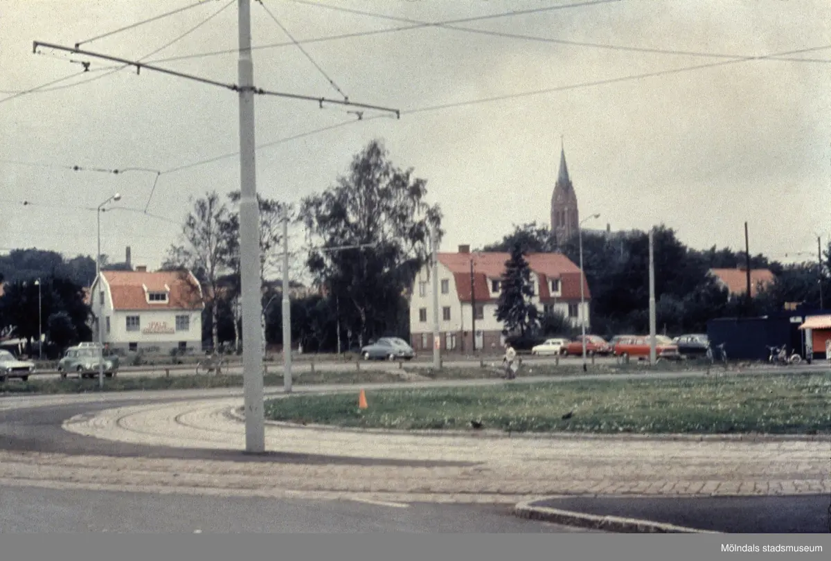 Spårvägens vändslinga på Broslätt i Mölndal, 1970-tal. I bakgrunden ses butiker på Storgatan samt Fässbergs kyrka.
