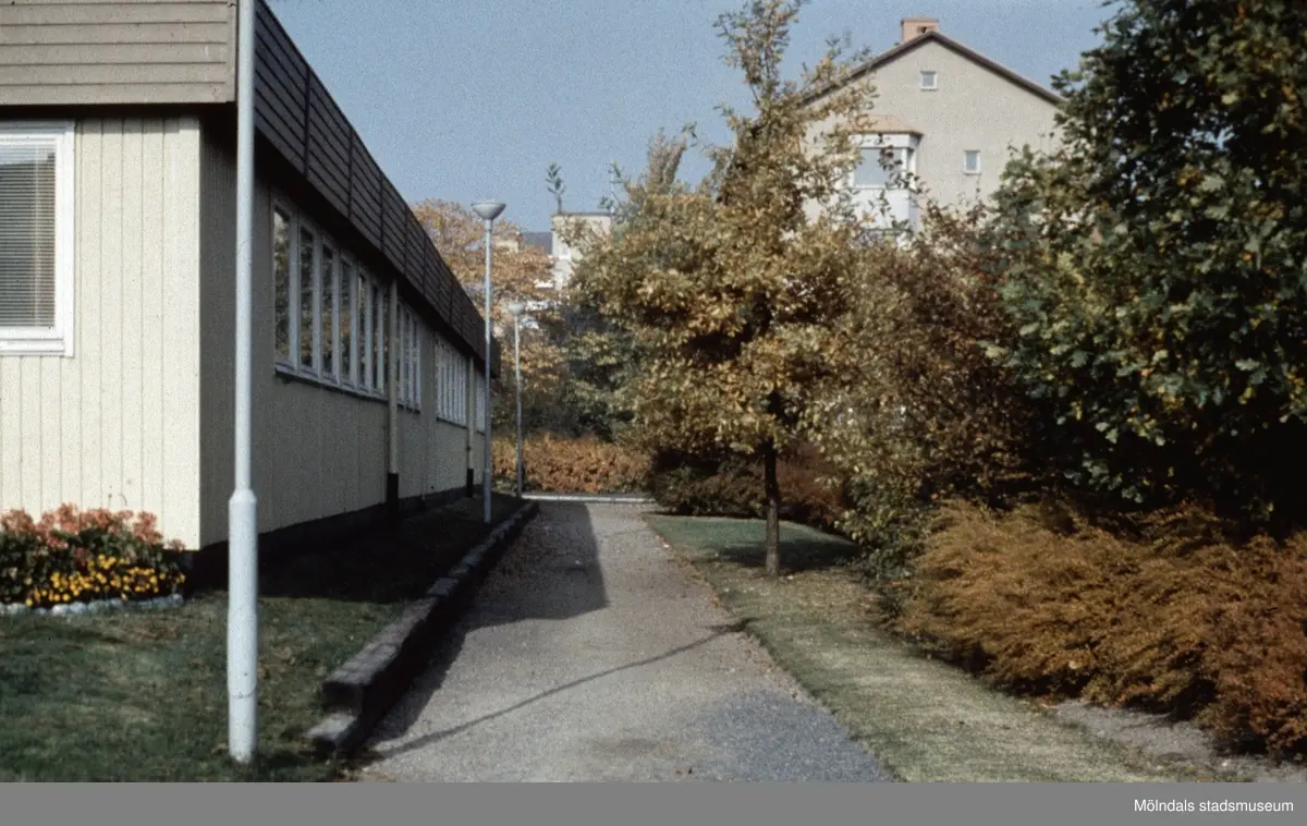 En paviljong i Stadshusparken i Mölndal, 1970-tal. I bakgrunden skymtar en byggnad på Knarrhögsgatan.