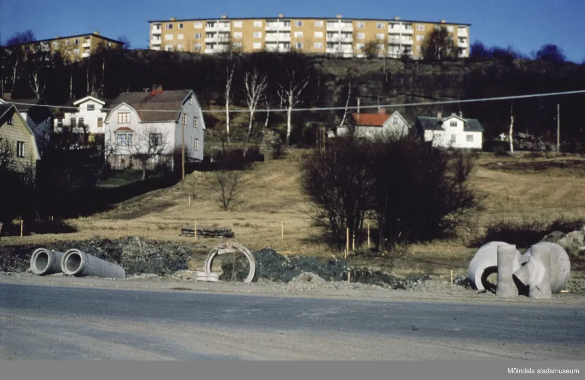 Bebyggelse vid Järnvägsgatan och Trädgårdsgatan i Mölndal, 1970-tal. Uppe på Störtfjället ses flerbostadshus vid Delbanco- och Lövgatan.