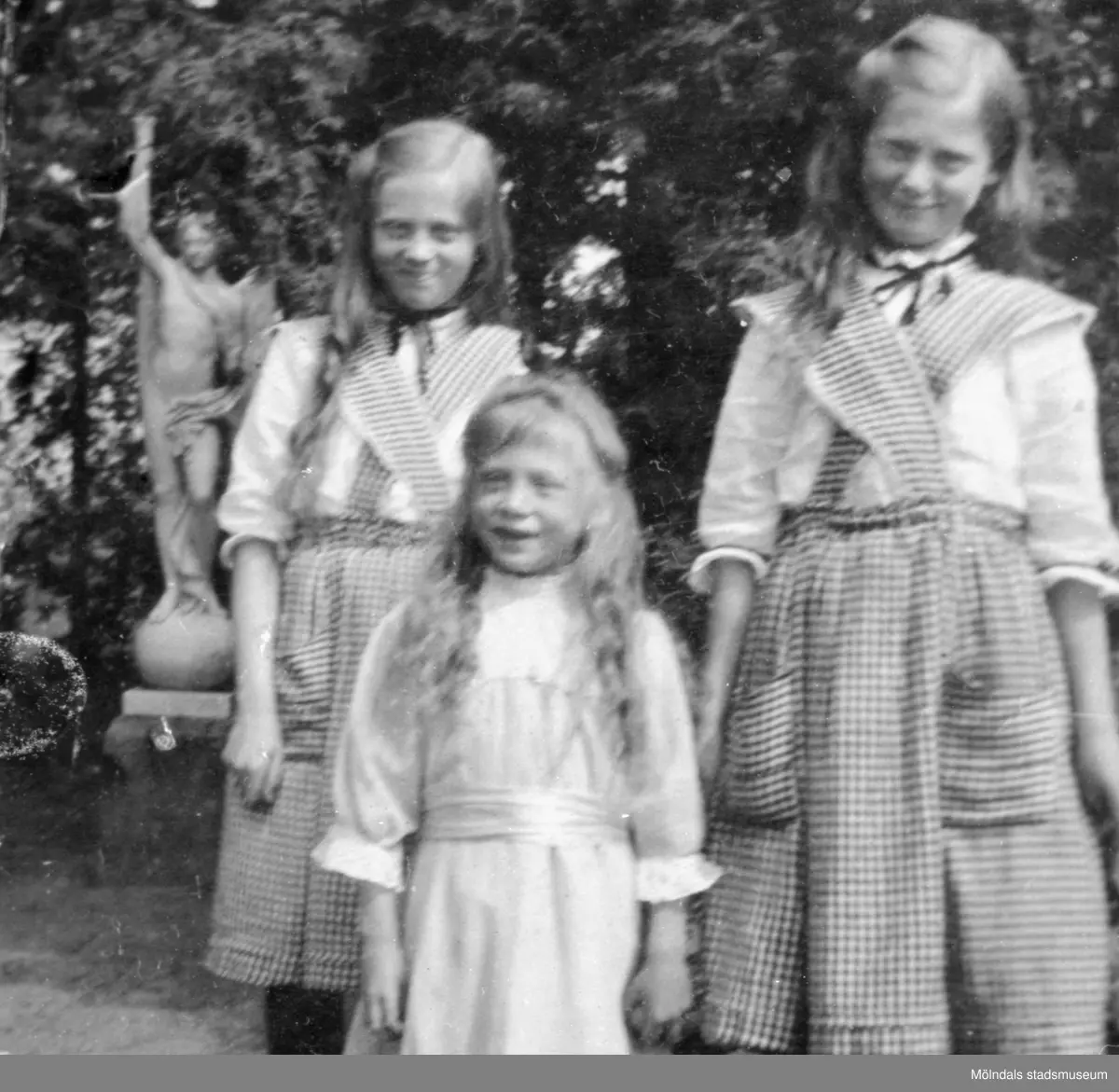 Systrarna Lindblom poserandes utomhus. Astrid, Hildur och lilla Calla framför. Man ser en staty i bakgrunden. 1930-40-tal. Döttrar till Gunnebo slottsanställda Karl August (1870-1949) och Hilma Sofia Viktoria (1876-1921) Lindblom.