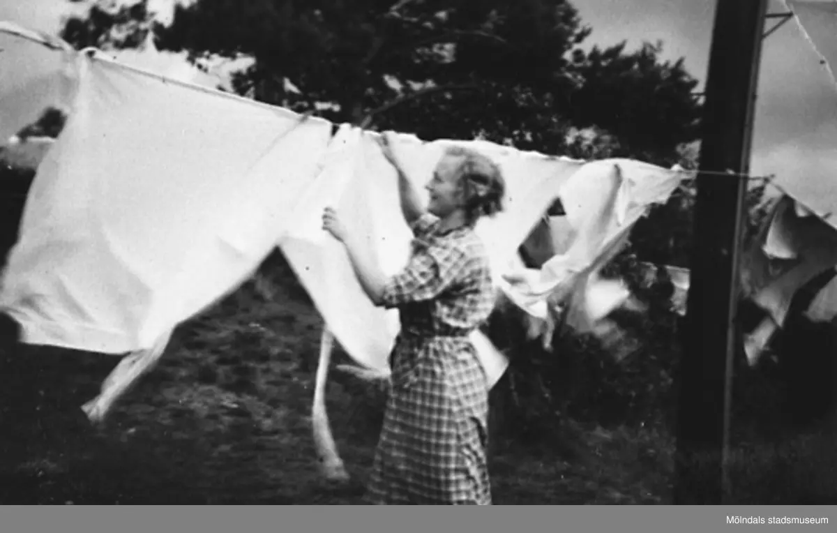 Rosa Krantz (gift Pettersson) hänger tvätt utanför personalbostaden på Stretered, 1922-1925.