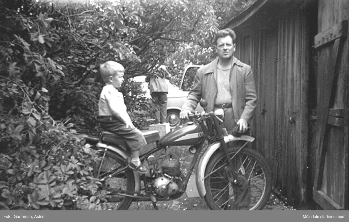 Jerry sitter på pappa Helmer Garthmans MC, Husqvarna 98cc, vid en vedbodlänga på Barnhemsgatan 21, år 1958.