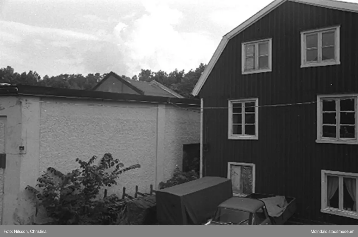 Röda huset med Spinneriet bakom. Grevedämmet, Kvarnfallet 31, Mölndal hösten 1994.
