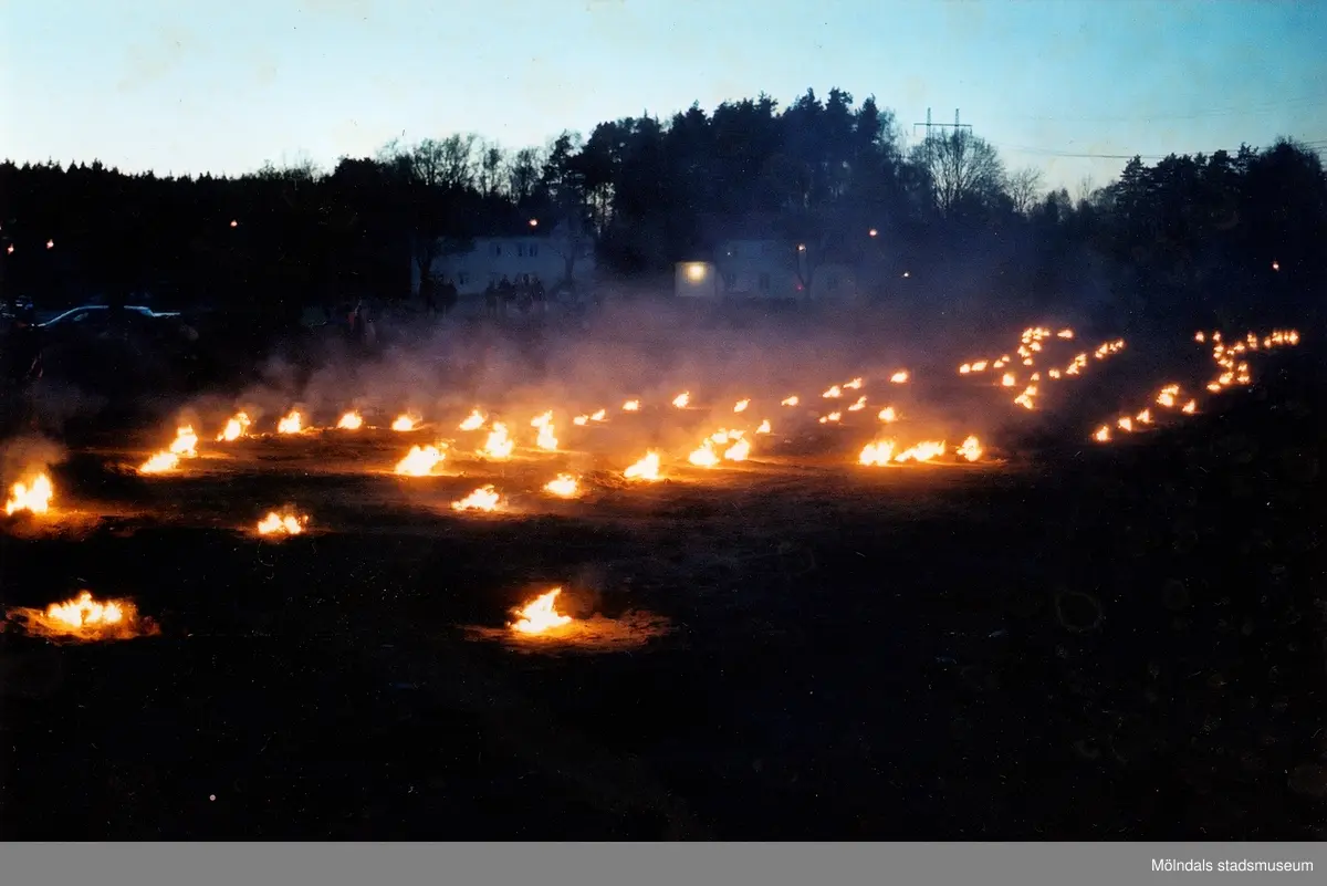 Arkeologisk undersökning av kokgropssystemet i Stretered, Kållered, våren 1998. Eldarna har tänts upp med hjälp av medlemmar från Fornminnesföreningen i Göteborg. Kultplats från bronsålder–äldre järnålder. Sammanlagt undersöktes 132 kokgropar som sträckte sig över en 250 m lång sträcka på krönet av en grusås. Kokgropssystemets norra del bestod av tre rader, medan det mot söder övergick till en rad.