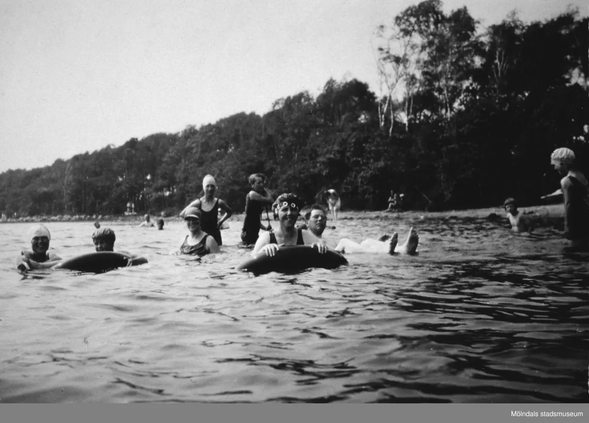 Vuxna och barn badar tillsammans, troligtvis i Tulebosjön cirka 1930.
