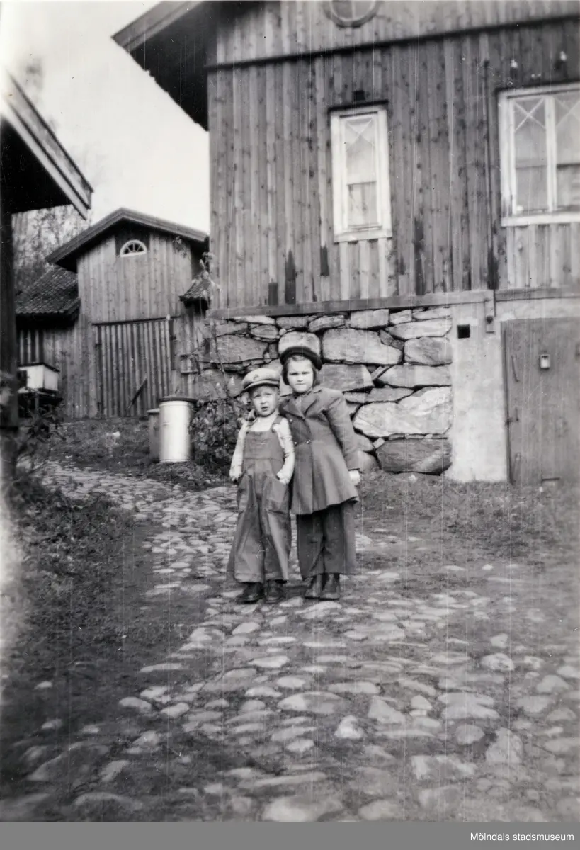 Porträtt av två små barn på gården Christinedal i östra Mölndal på 1950-talet. I bakgrunden ses ett par av gårdens ekonomibyggnader. Gården har gett namn åt området Kristinedal och var belägen i vinkeln mellan nuvarande Rådavägen och Brovaktaregatan. År 1960 såldes gården till Fastighetsbolaget Betongblandaren (Skånska Cementgjuteriet) och revs när det nuvarande bostadsområdet anlades.