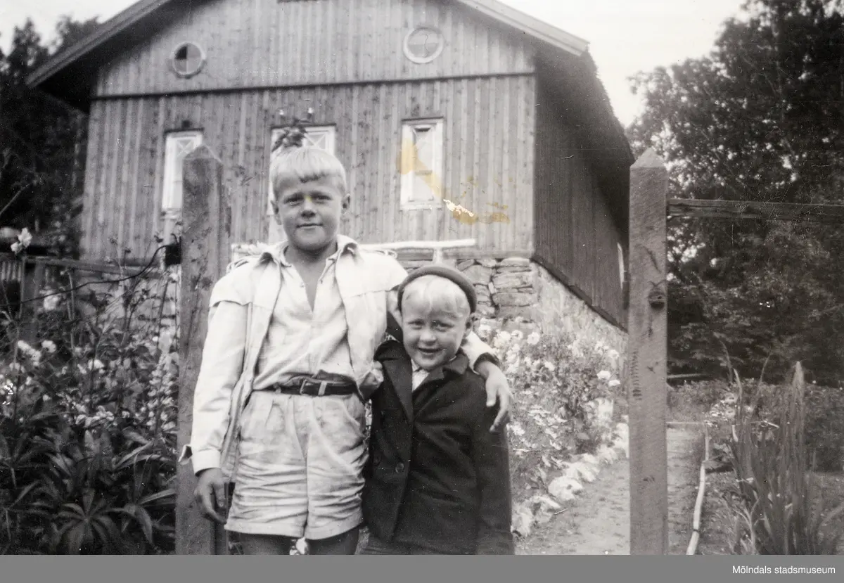 Porträtt av två pojkar på gården Christinedal i östra Mölndal på 1950-talet. I bakgrunden ses en av gårdens ekonomibyggnader. Gården har gett namn åt området Kristinedal och var belägen i vinkeln mellan nuvarande Rådavägen och Brovaktaregatan. År 1960 såldes gården till Fastighetsbolaget Betongblandaren (Skånska Cementgjuteriet) och revs när det nuvarande bostadsområdet anlades.