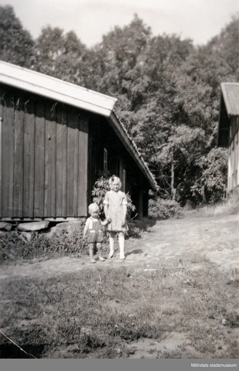 Porträtt av två små flickor på gården Christinedal i östra Mölndal på 1950-talet. I bakgrunden ses en av gårdens ekonomibyggnader. Gården har gett namn åt området Kristinedal och var belägen i vinkeln mellan nuvarande Rådavägen och Brovaktaregatan. År 1960 såldes gården till Fastighetsbolaget Betongblandaren (Skånska Cementgjuteriet) och revs när det nuvarande bostadsområdet anlades.