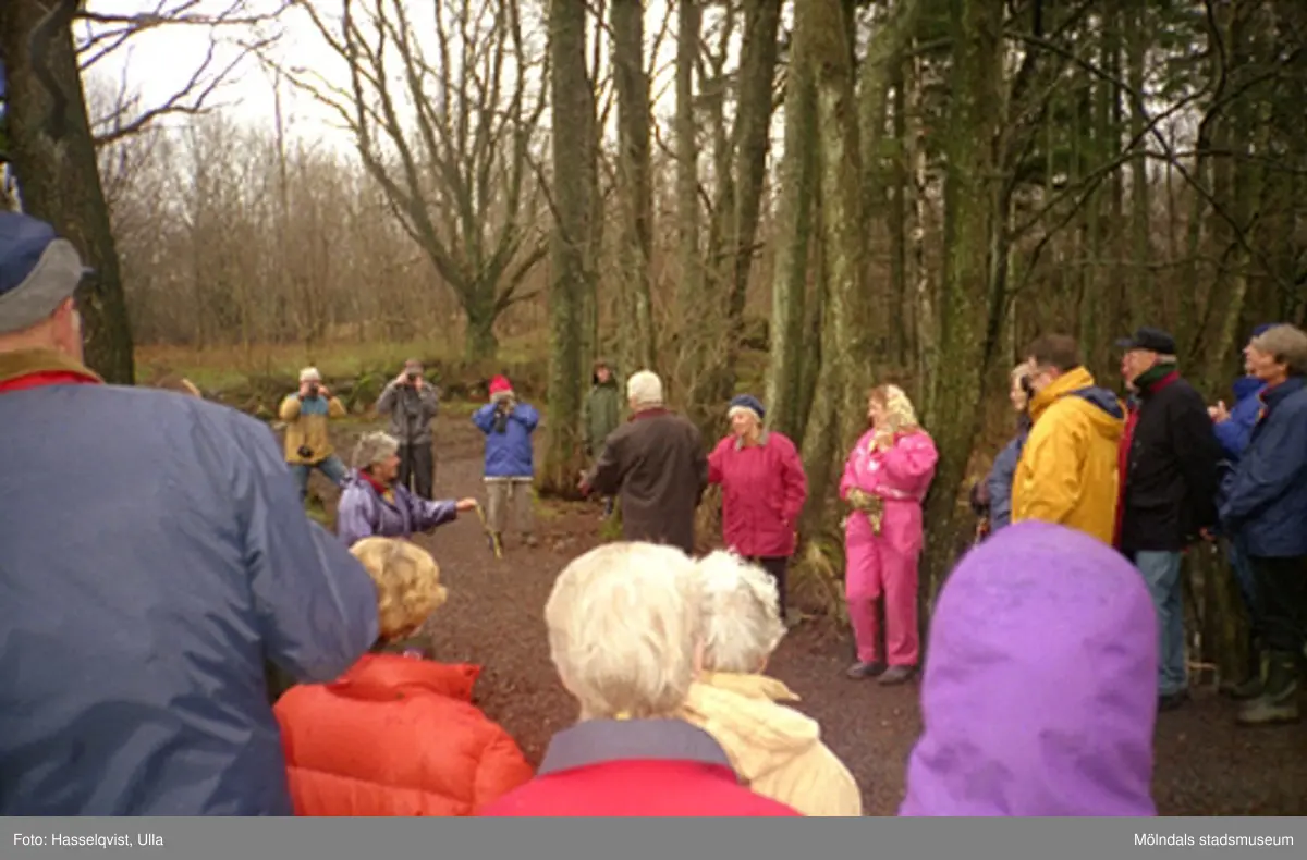 Barn och vuxna vandrar vid invigningen av Natur- och Kulturstigen i Livered, Kållered, år 2000.