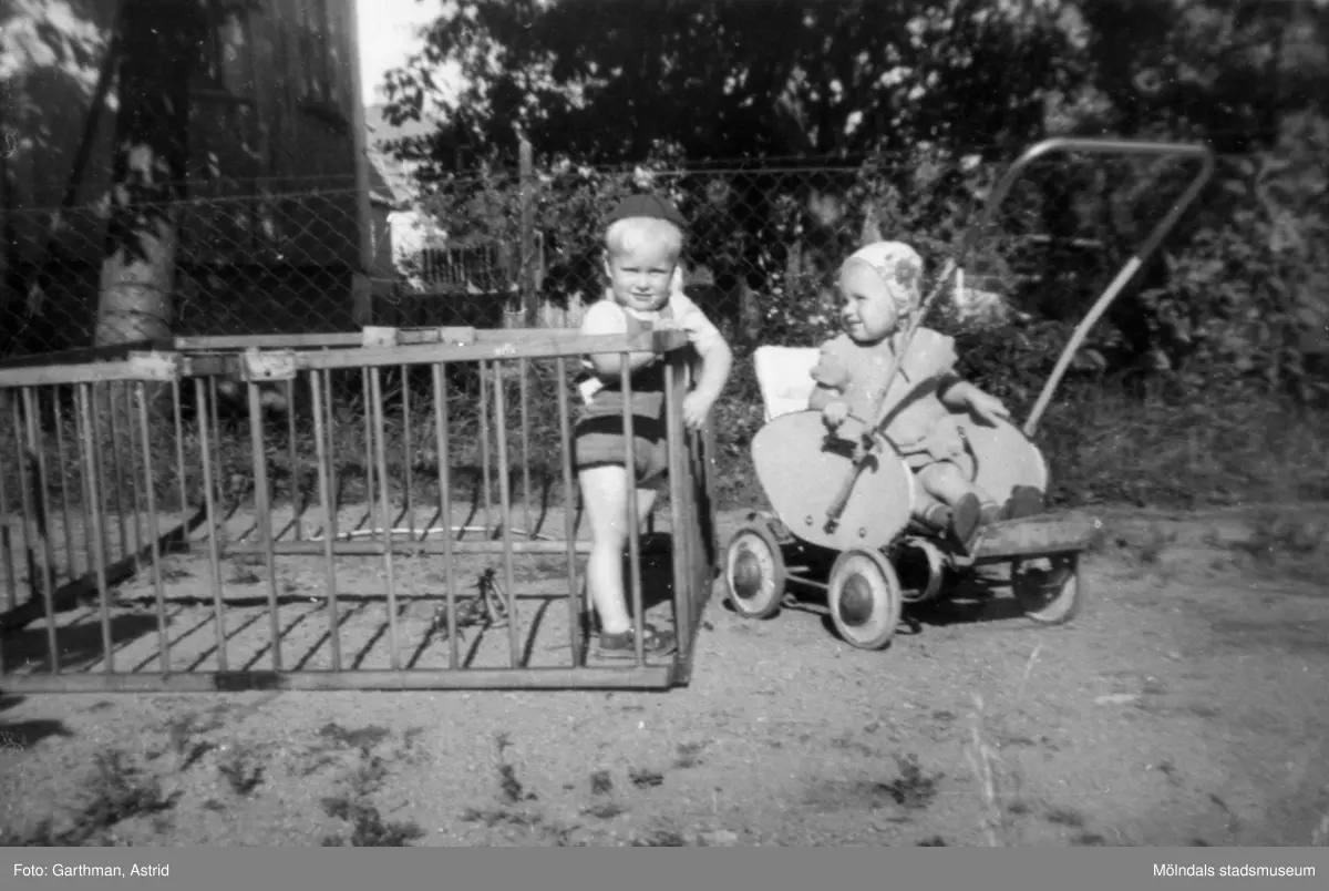 Lille Alf Garthman står i en barnhage och Gunilla Andersson (sittandes i en kärra) tittar på. Barnhemsgatan 21, slutet/början av 1940-50-tal.