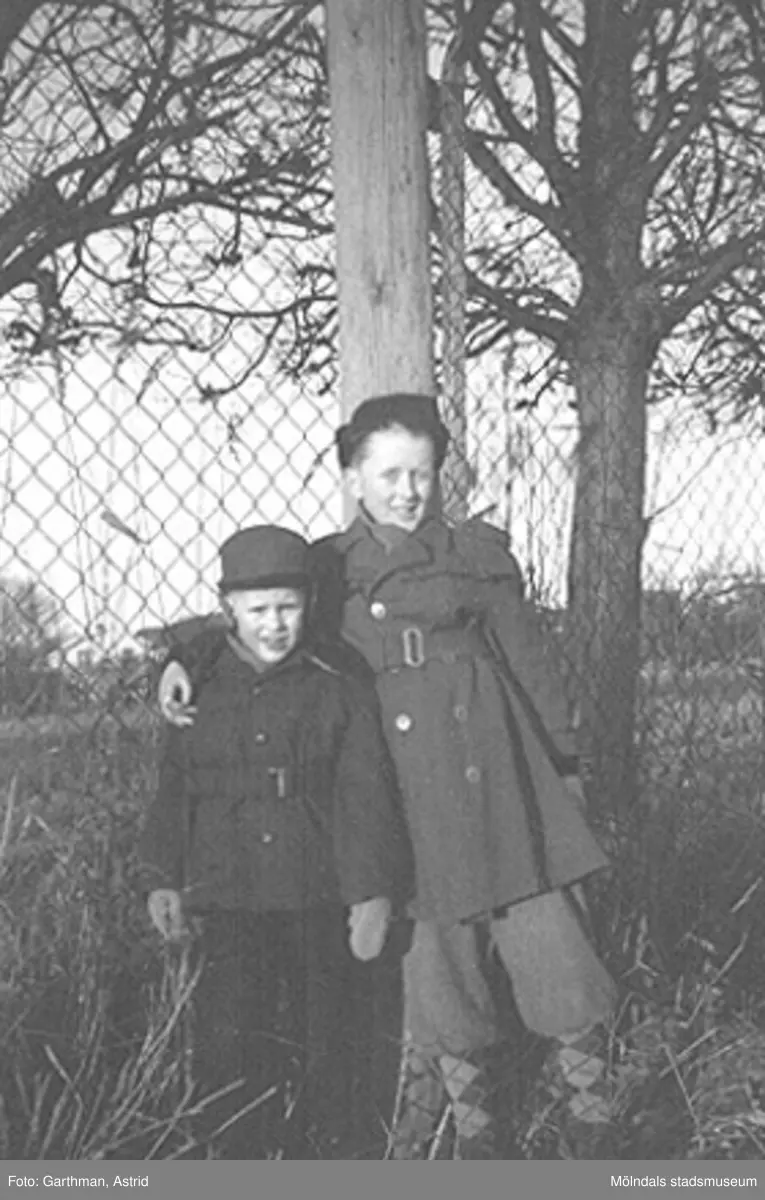 Bröderna Alf och Leif Garthman står lutade mot ett träd i Forsåker, 1954.