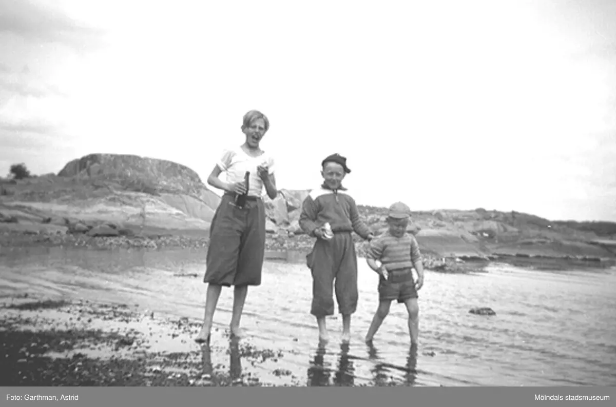 Morbror Rolf Karlsson går i vattnet tillsammans med Leif och Alf Garthman. Näset, 1954-55.