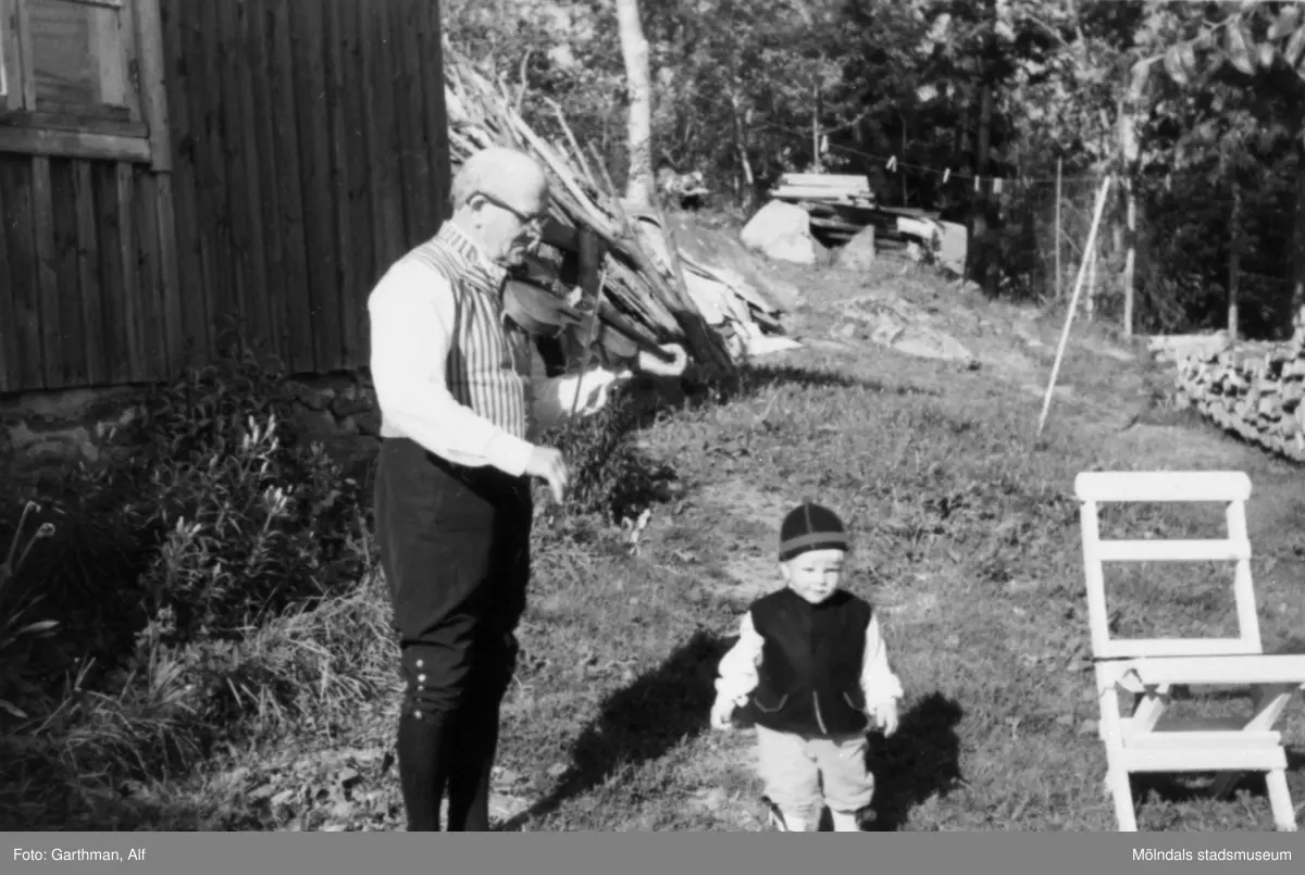 Arvid Svensson (f. 1903), murare och spelman, spelar fiol för barnbarnet Anders Garthman (f. 1968). Arvid är morfar till Anders. Långö, Hällesåker, 1970-tal.