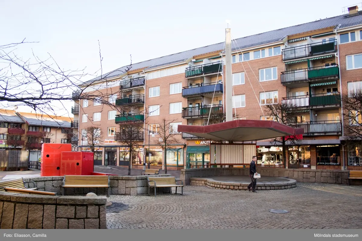 Mölndals torg 2-4 (Havskatten 17), år 2015. Bild 1: torget med Bergmansgatan till höger. På torget finns en scen, bänkar och en röd lekborg för barn. Bild 2: butiker. Bild 3-4: nordost mot Bergmansgatan. Bild 5: Ronnix shoes med entré mot torget. Dokumentation av platsen innan rivning och nybyggnation.