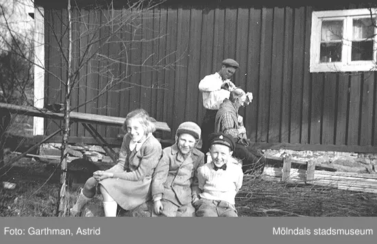 Folke Larsson står och klipper en släkting i bakgrunden, På stubben framför sitter tre barn; en flicka samt kusinerna Per-Olof Larsson och Leif Garthman. Toltorpsdalen, 1950-tal.