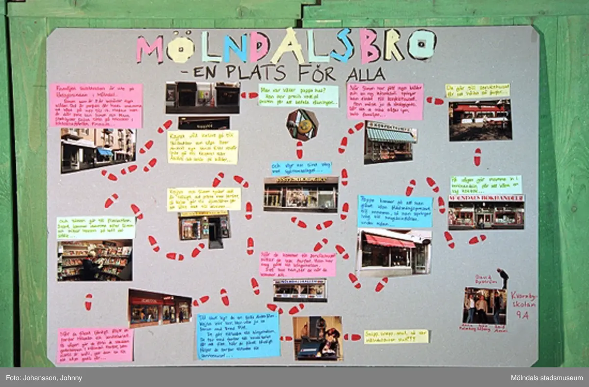 Utställning på Mölndals museum vecka 44 och 45 samt i Stadshushallen vecka 46, år 1996. Mölndalsbro i dag - ett skolpedagogiskt dokumentationsprojekt på Mölndals museum under oktober 1996. 1996_1358-1363 är gjorda av högstadieelever från Kvarnbyskolan 9A. Se även gruppbilder på klasserna 1996_1382-1405 och samtliga bilder från den färdiga utställningen 1996_1358-1381.