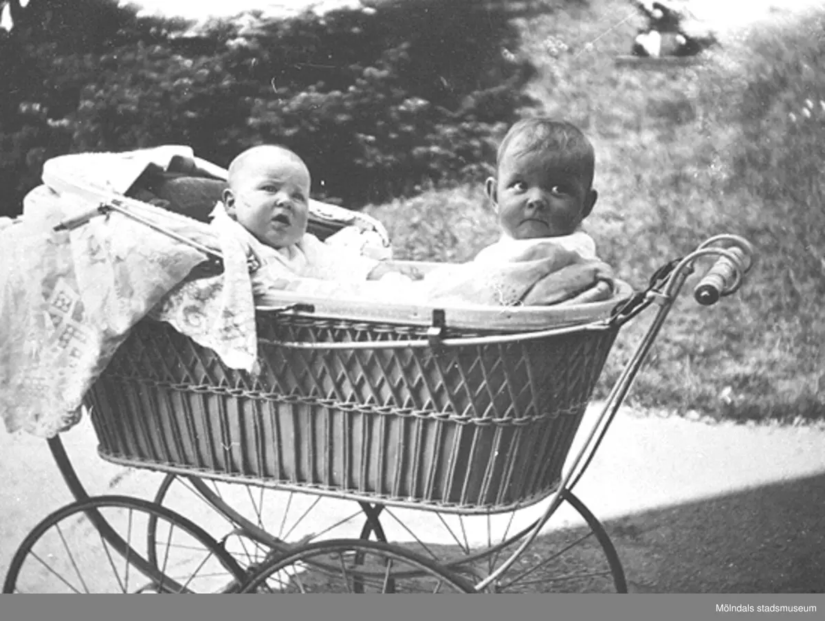 Två barn i en barnvagn. Det ena torde vara Ursula Vitzthum von Eckstädt, friherrinnan Hilda Sparres enda barnbarn. Ur minnesalbum 1 av Hilda Sparre.