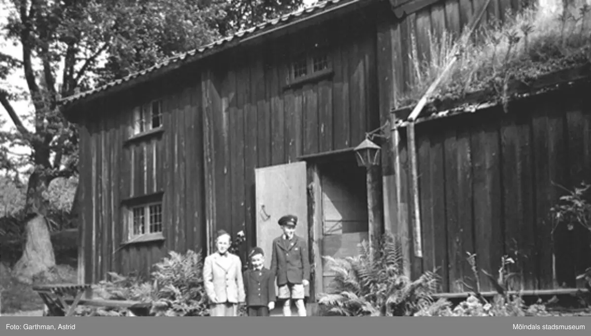Smålandsstugan i Slottskogen 1954. Från vänster står Per-Olof samt kusinerna bröderna Alf och Leif Garthman.