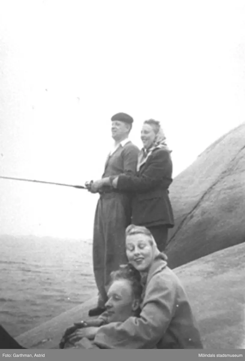 Sportfiske vid Näset, 1950-tal. Till vänster sitter Ingrid Karlsson med fästman. Stående från vänster: Helmer Garthman och Kerstin Karlsson.
