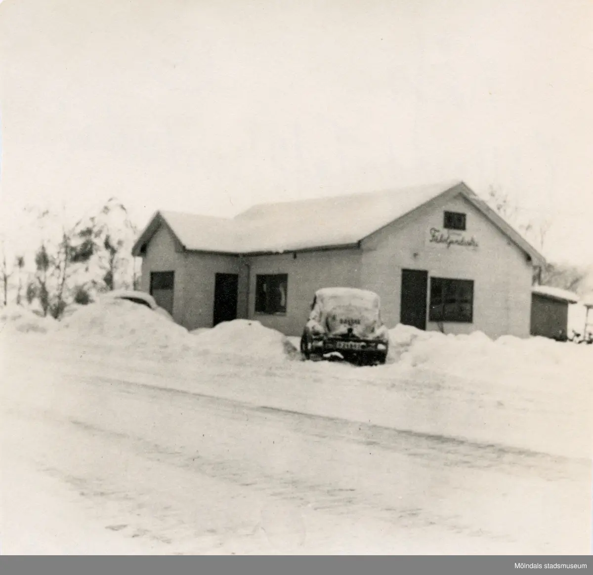 Kållereds Fåtöljindustri vid Torrekullavägen i Kållered. Verkstaden före sammanbyggningen. Foto från 1955-1957. Utanför byggnaden står ägaren Paul Kristofferssons svarta Volvo PV444 modell A (1950/51) registreringsnummer O 24503. Den har dubbla nummerskyltar pga utdragbar släpkärra. Bilen byttes senare till en av årsmodell 1957.