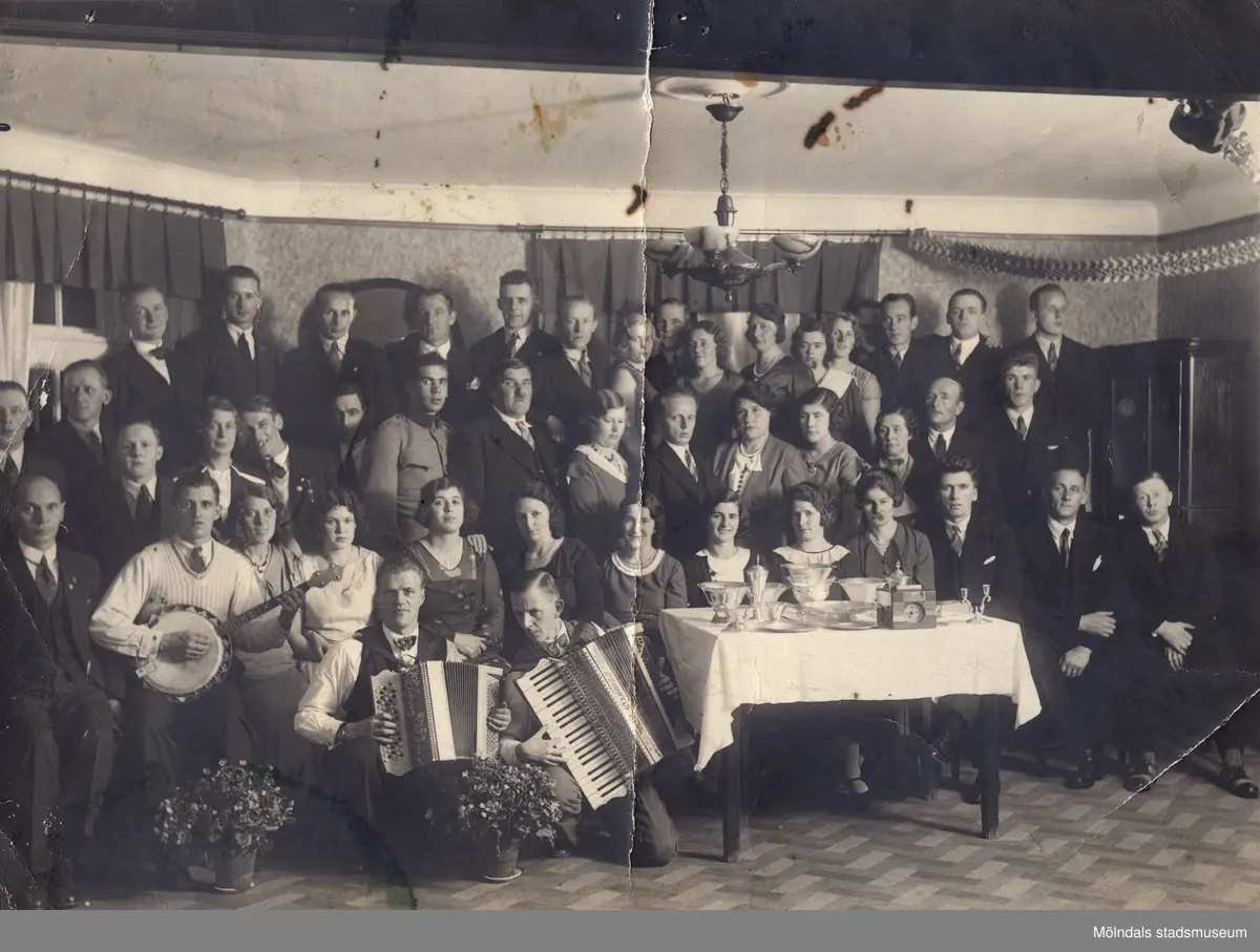 Fotografi från Mölndals Brevduveklubb år 1934. De står troligtvis i Godhem för där hade man små rum.