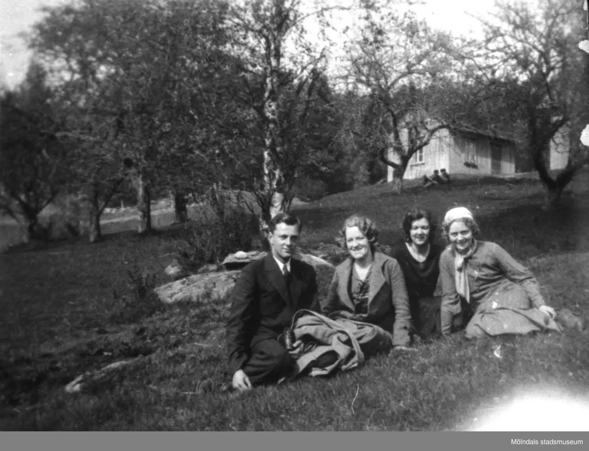 En okänd man, Clary Belfrage, Iris Persson (som gift) och Rosa Pettersson (f. Krantz) sitter i gräset framför en stuga, okänd plats och datum.