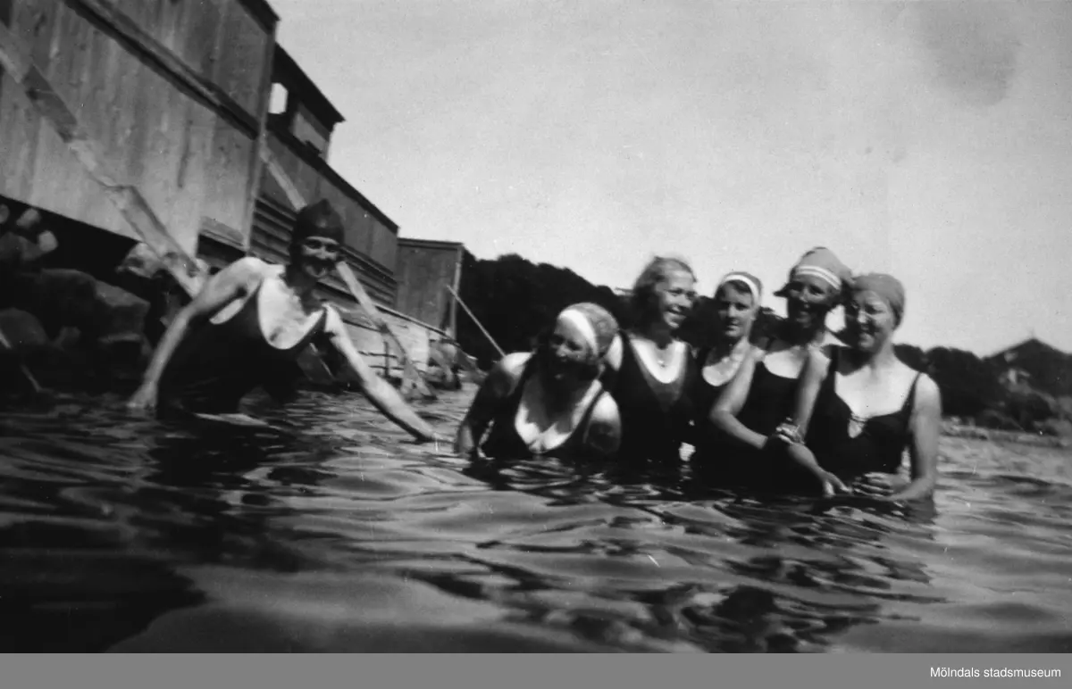 Sex badklädda kvinnor som står i vattnet, troligtvis i Tulebosjön, cirka 1930. Relaterat motiv: 2007_0295.