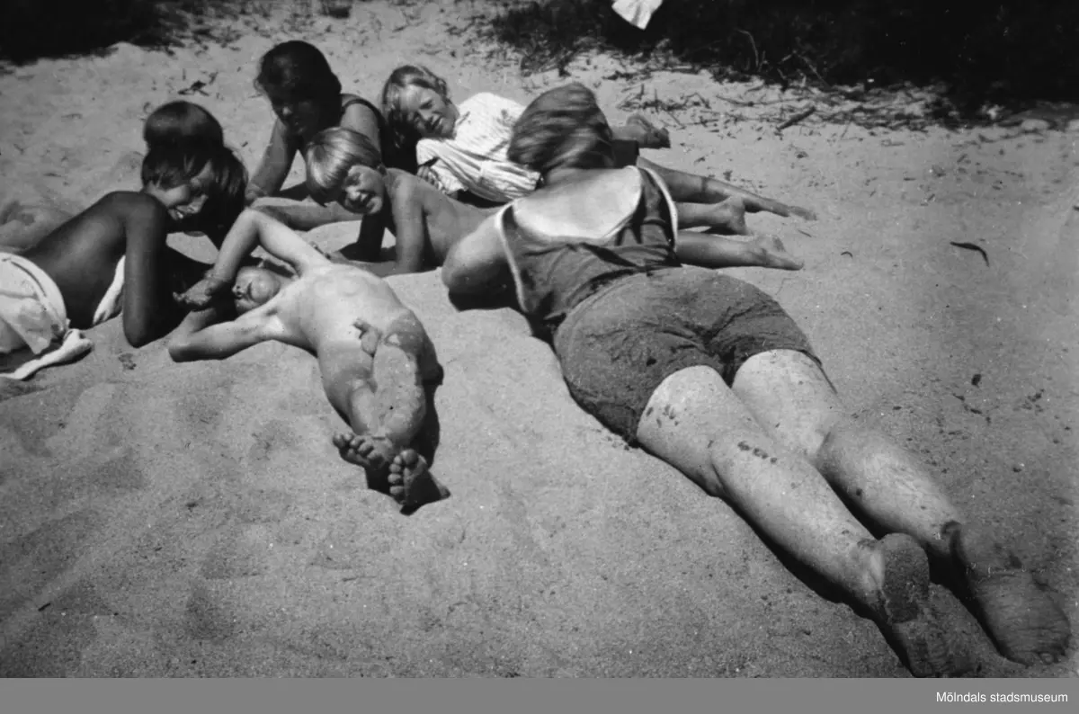 Två kvinnor och fyra barn ligger och solar på sanden, troligtvis Tulebostranden cirka 1930.