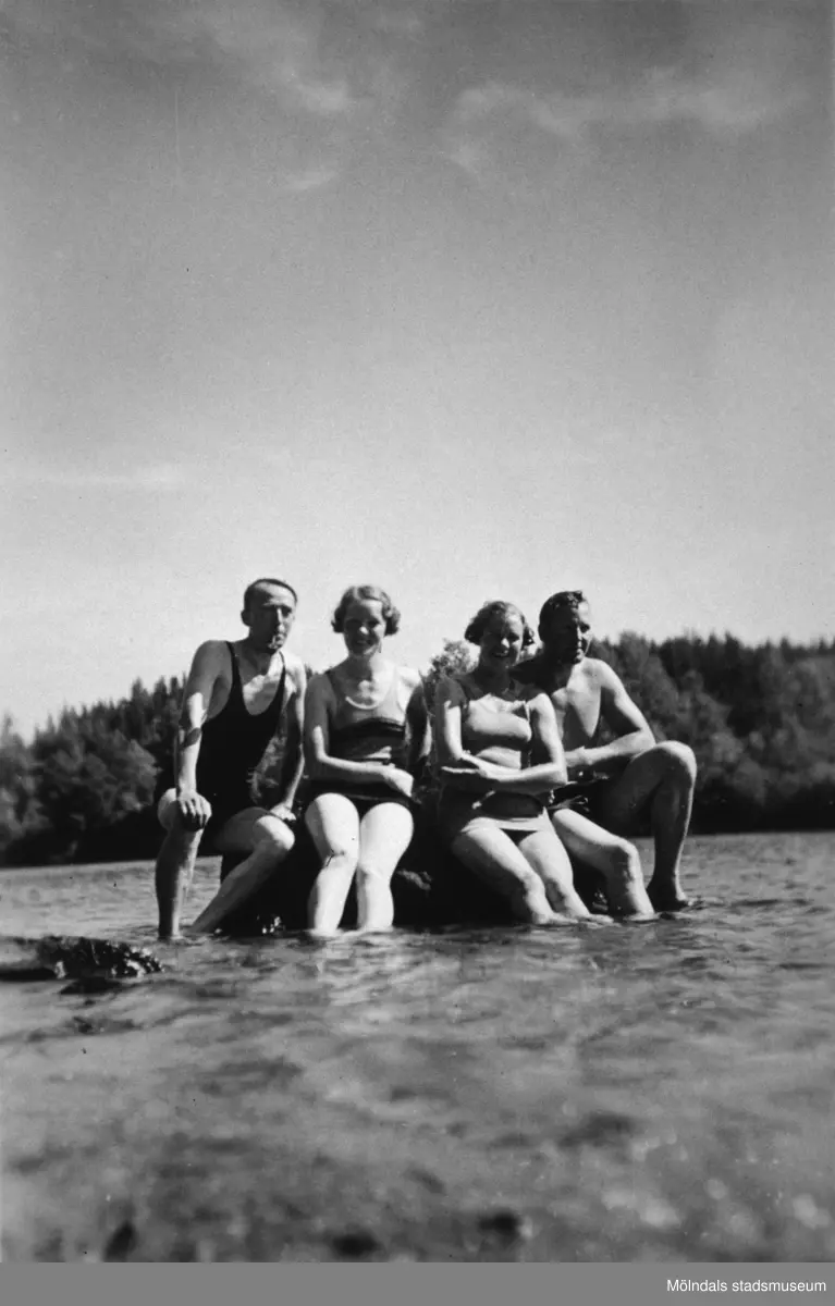 Fyra personer sitter på en sten ute i vattnet, troligtvis i Tulebosjön cirka 1930.