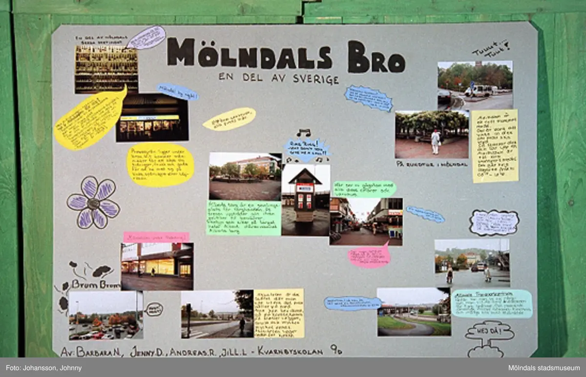 Utställning på Mölndals museum vecka 44 och 45 samt i Stadshushallen vecka 46, år 1996. Mölndalsbro i dag - ett skolpedagogiskt dokumentationsprojekt på Mölndals museum under oktober 1996. 1996_1370-1375 är gjorda av högstadieelever från Kvarnbyskolan 9D. Se även gruppbilder på klasserna 1996_1382-1405 och samtliga bilder från den färdiga utställningen 1996_1358-1381.
