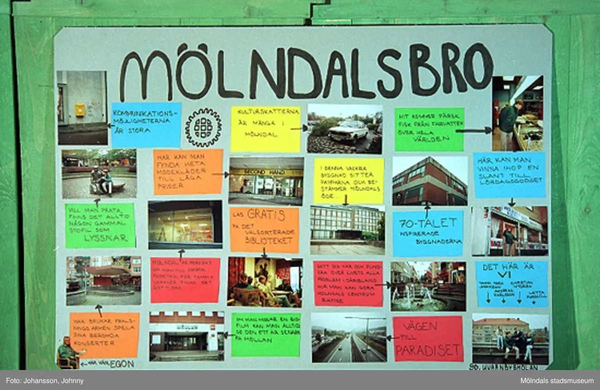 Titel: Utställning på Mölndals museum vecka 44 och 45 samt i Stadshushallen vecka 46, år 1996. Mölndalsbro i dag - ett skolpedagogiskt dokumentationsprojekt på Mölndals museum under oktober 1996. 1996_1370-1375 är gjorda av högstadieelever från Kvarnbyskolan 9D. Se även gruppbilder på klasserna 1996_1382-1405 och samtliga bilder från den färdiga utställningen 1996_1358-1381.