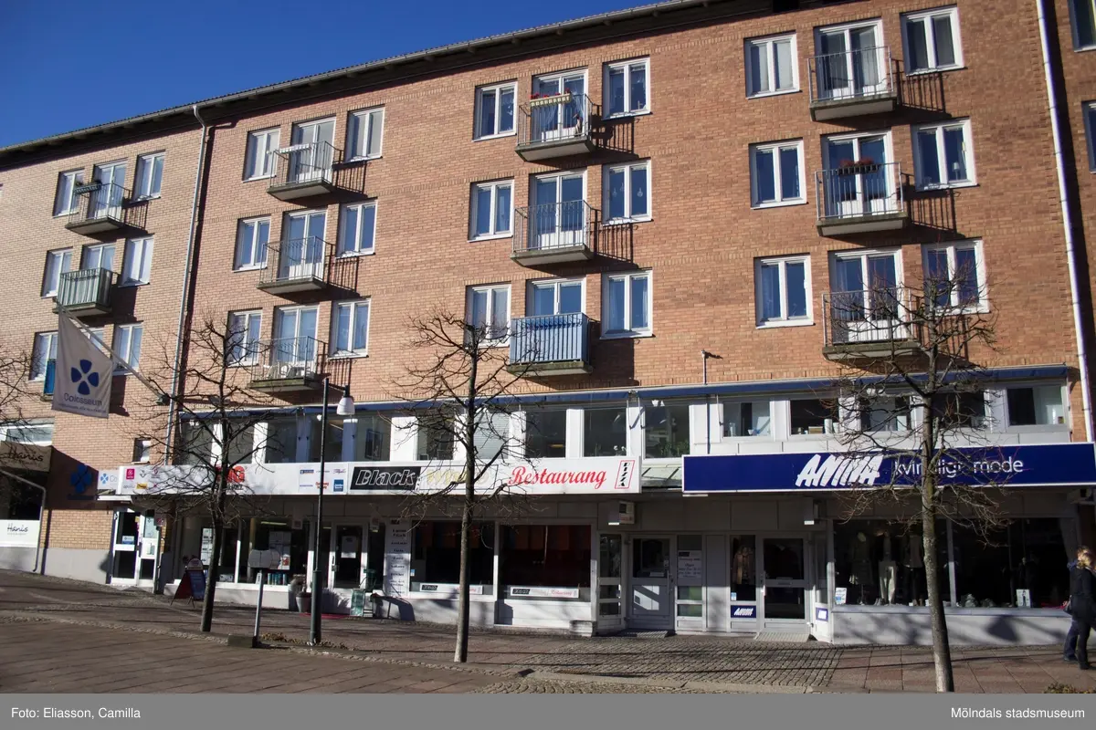 Mölndals torg, år 2015. Bild 1: Havskatten 12. Bild 2: en scen, bänkar och en röd lekborg för barn. Havskatten 17 ses i bakgrunden och Bergmansgatan till vänster. Bild 3: Till vänster ses Havskatten 12 och del av Bergmansgatan till höger. Bild 4: Kronans Apotek, Mölndals torg 4. Dokumentation av platsen innan rivning och nybyggnation.