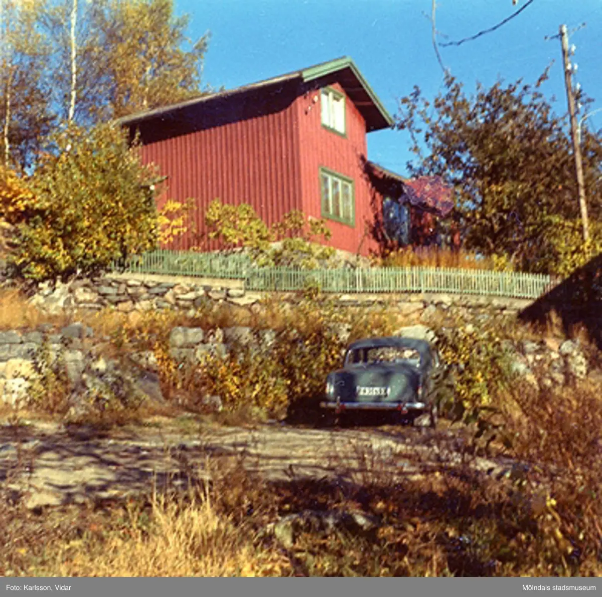 Roten F23 B, ett rött bostadshus med en svart bil som står parkerad i slänten.